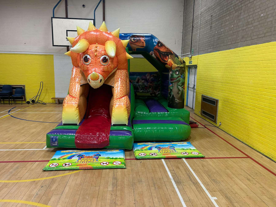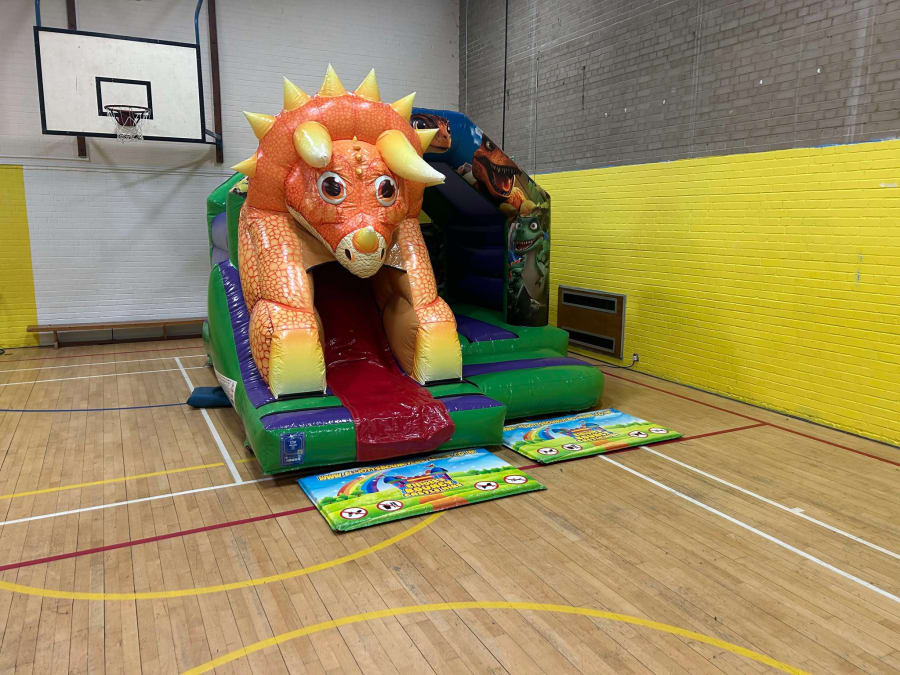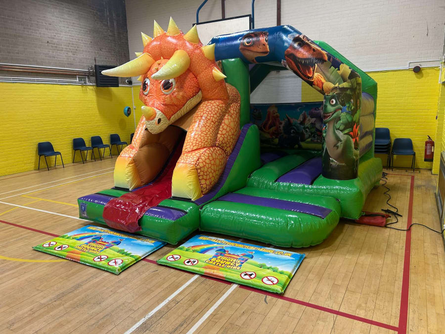 Rather than just artwork printed on the material, this bouncy castle actually features a 3D dinosaur on the front and over the slide - It's super friendly and not too scary, ideal for a broad age range!