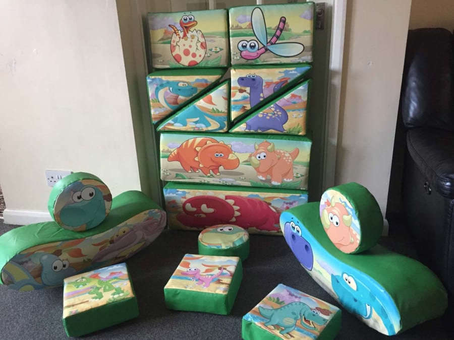 This is our deluxe Dino soft play set. It's a 16 piece set full of different Dinosaurs and shapes, including jelly bean rockers! It comes with a very large matching green tile matted area that can be fitted to virtually any shape or space!